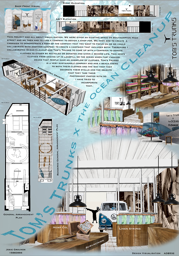 This was a project that was about the visualisation of a shop. We chose the two companies that we wanted to merge. I wanted my shop to be sustainable with a strong focus on the recycling of clothes so I paired a small private company with a large Ocean Cleanup company with the main focus as having a place that members of the public to be able to recycle/up-cycle their old unwanted clothes. The shop was based in a current floor plan on Southampton High Street.